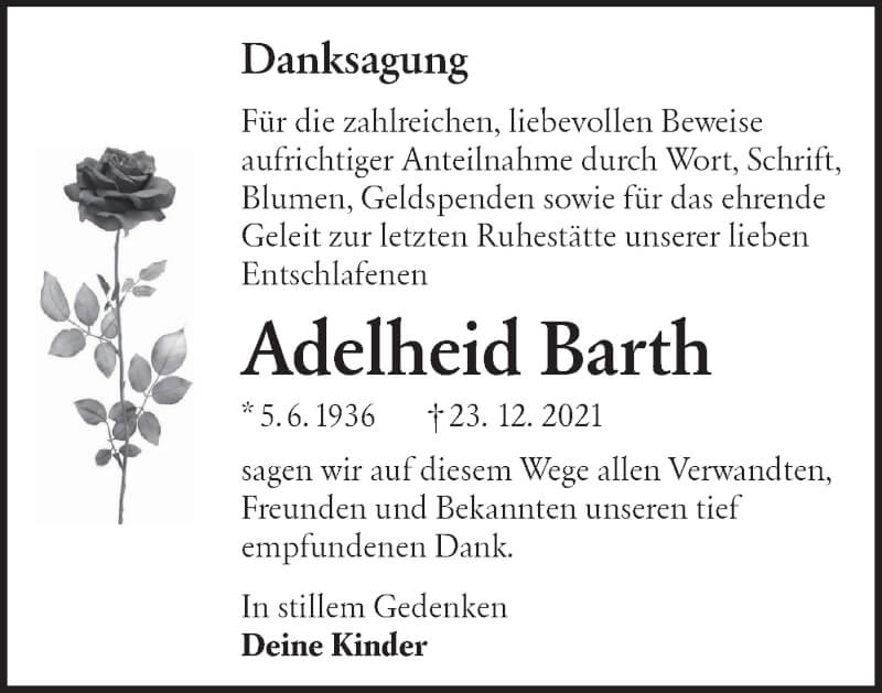 Hier finden Sie alle Traueranzeigen aus der Zeitung, die bisher für Adelheid Barth erschienen sind. Weitere Traueranzeigen, die in der Zeitung erscheinen, werden hier ebenfalls aufgelistet