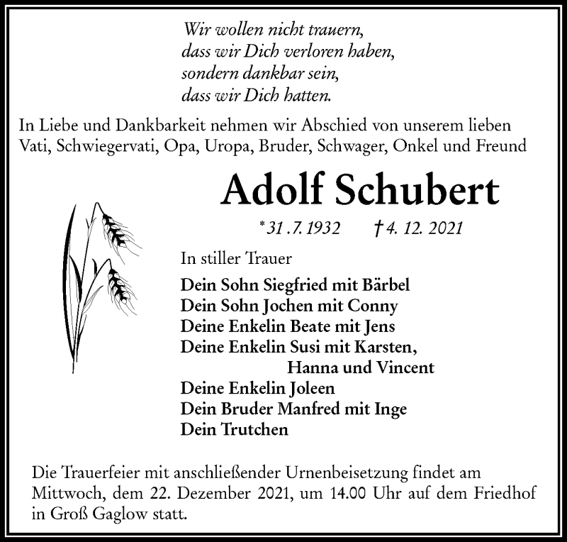 Hier finden Sie alle Traueranzeigen aus der Zeitung, die bisher für Adolf Schubert erschienen sind. Weitere Traueranzeigen, die in der Zeitung erscheinen, werden hier ebenfalls aufgelistet