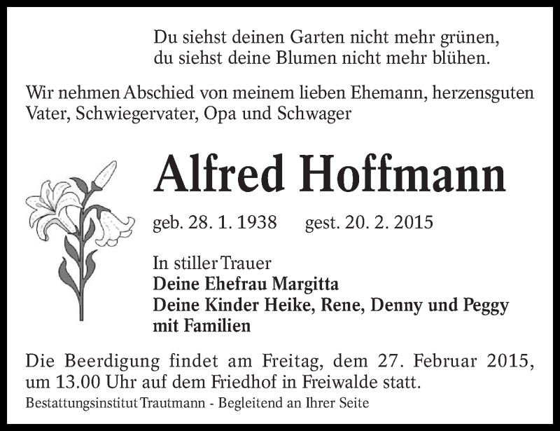 Hier finden Sie alle Traueranzeigen aus der Zeitung, die bisher für Alfred Hoffmann erschienen sind. Weitere Traueranzeigen, die in der Zeitung erscheinen, werden hier ebenfalls aufgelistet