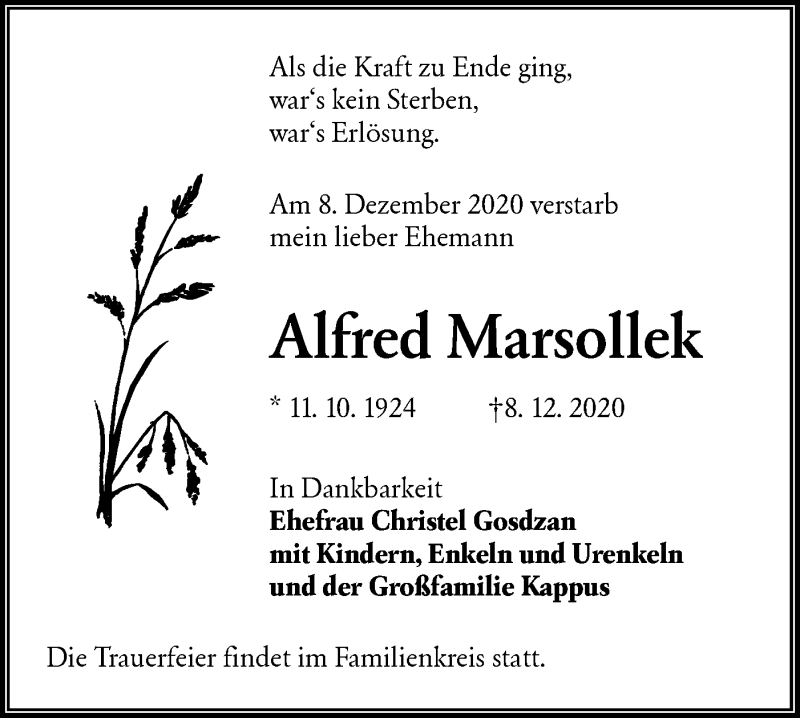 Hier finden Sie alle Traueranzeigen aus der Zeitung, die bisher für Alfred Marsollek erschienen sind. Weitere Traueranzeigen, die in der Zeitung erscheinen, werden hier ebenfalls aufgelistet