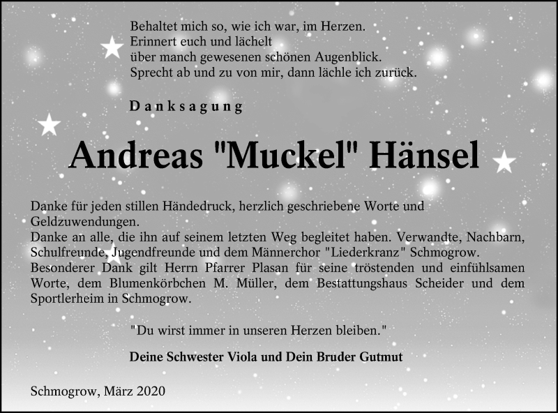 Hier finden Sie alle Traueranzeigen aus der Zeitung, die bisher für Andreas Hänsel erschienen sind. Weitere Traueranzeigen, die in der Zeitung erscheinen, werden hier ebenfalls aufgelistet