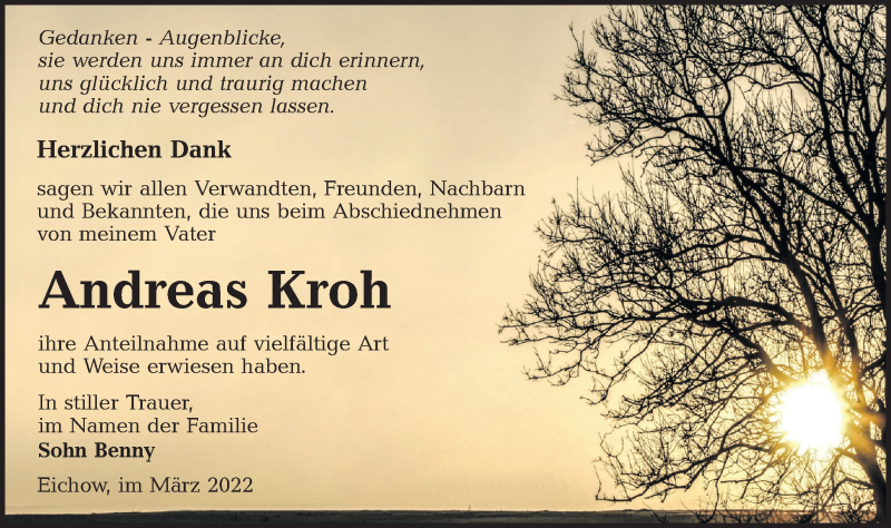 Hier finden Sie alle Traueranzeigen aus der Zeitung, die bisher für Andreas Kroh erschienen sind. Weitere Traueranzeigen, die in der Zeitung erscheinen, werden hier ebenfalls aufgelistet