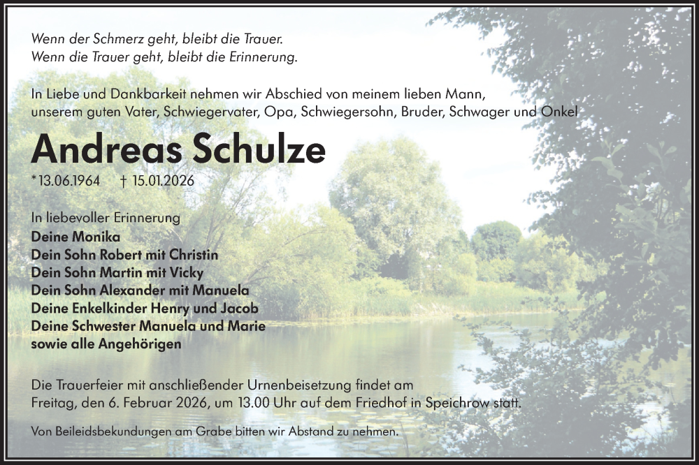 Hier finden Sie alle Traueranzeigen aus der Zeitung, die bisher für Andreas Schulze erschienen sind. Weitere Traueranzeigen, die in der Zeitung erscheinen, werden hier ebenfalls aufgelistet