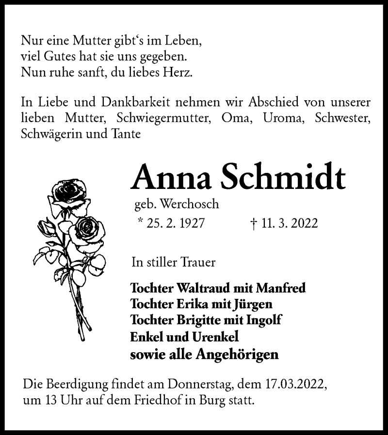 Hier finden Sie alle Traueranzeigen aus der Zeitung, die bisher für Anna Schmidt erschienen sind. Weitere Traueranzeigen, die in der Zeitung erscheinen, werden hier ebenfalls aufgelistet