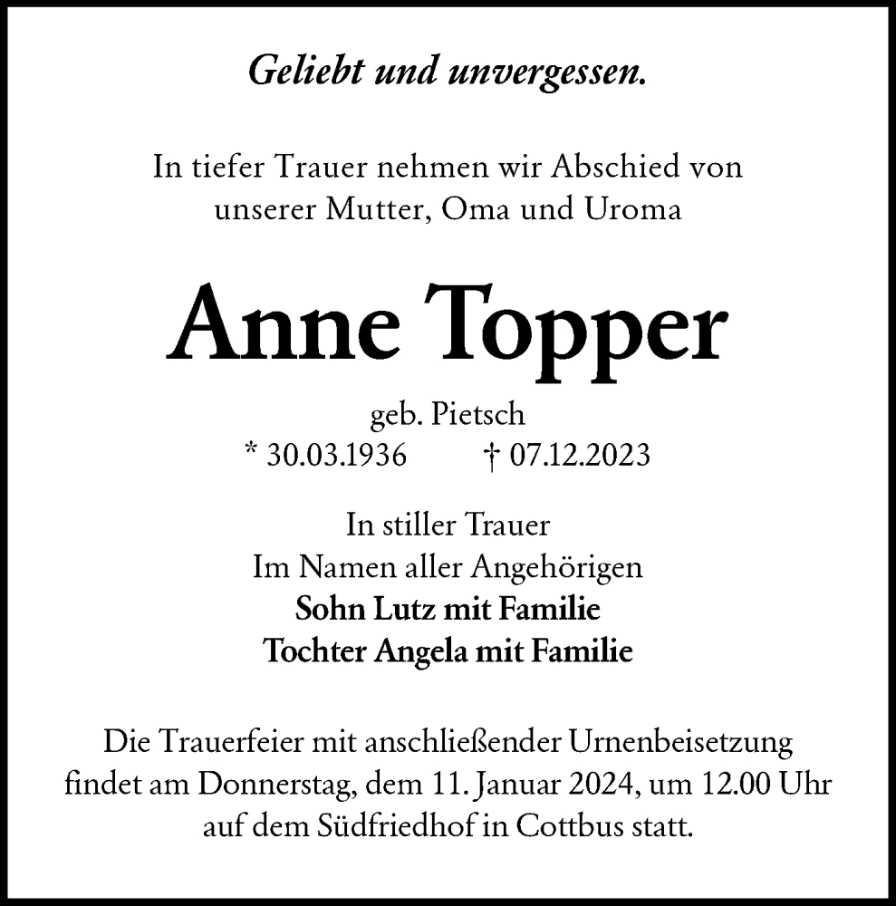Hier finden Sie alle Traueranzeigen aus der Zeitung, die bisher für Anne Topper erschienen sind. Weitere Traueranzeigen, die in der Zeitung erscheinen, werden hier ebenfalls aufgelistet