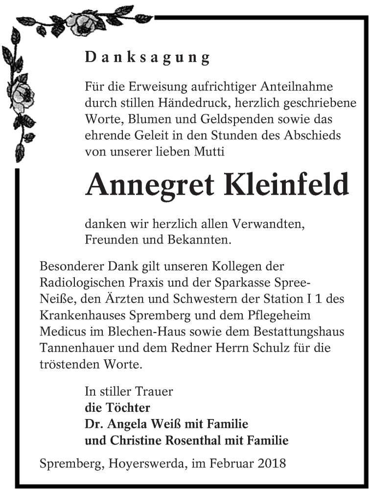 Hier finden Sie alle Traueranzeigen aus der Zeitung, die bisher für Annegret Kleinfeld erschienen sind. Weitere Traueranzeigen, die in der Zeitung erscheinen, werden hier ebenfalls aufgelistet