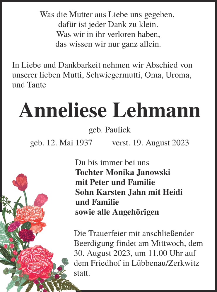 Hier finden Sie alle Traueranzeigen aus der Zeitung, die bisher für Anneliese Lehmann erschienen sind. Weitere Traueranzeigen, die in der Zeitung erscheinen, werden hier ebenfalls aufgelistet