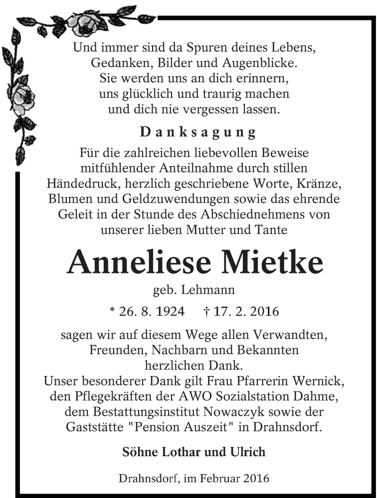 Hier finden Sie alle Traueranzeigen aus der Zeitung, die bisher für Anneliese Mietke erschienen sind. Weitere Traueranzeigen, die in der Zeitung erscheinen, werden hier ebenfalls aufgelistet