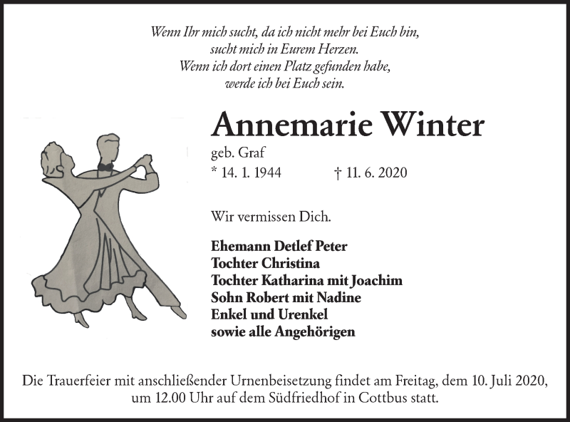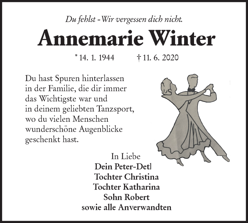 Hier finden Sie alle Traueranzeigen aus der Zeitung, die bisher für Annemarie Winter erschienen sind. Weitere Traueranzeigen, die in der Zeitung erscheinen, werden hier ebenfalls aufgelistet