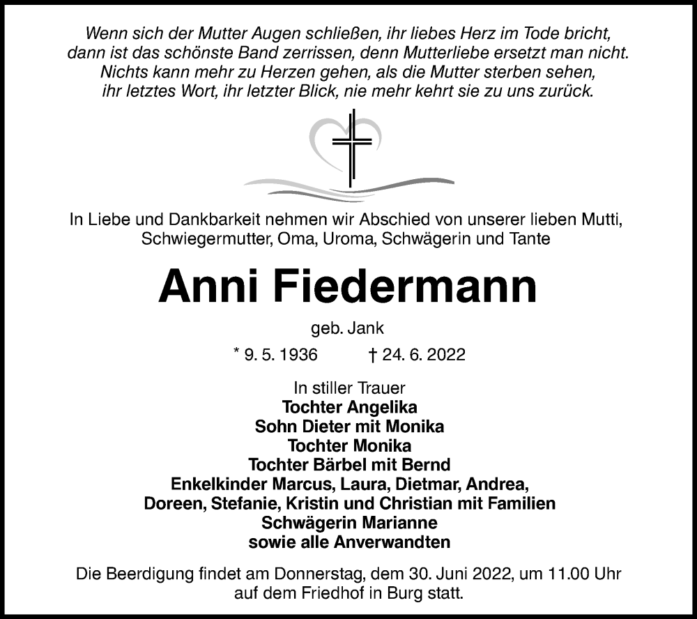 Hier finden Sie alle Traueranzeigen aus der Zeitung, die bisher für Anni Fiedermann erschienen sind. Weitere Traueranzeigen, die in der Zeitung erscheinen, werden hier ebenfalls aufgelistet