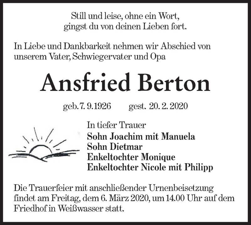 Hier finden Sie alle Traueranzeigen aus der Zeitung, die bisher für Ansfried Berton erschienen sind. Weitere Traueranzeigen, die in der Zeitung erscheinen, werden hier ebenfalls aufgelistet