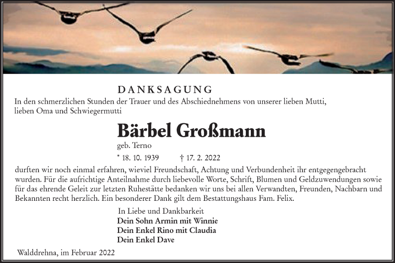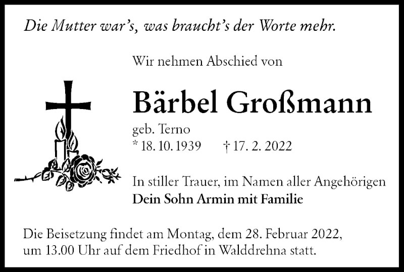 Hier finden Sie alle Traueranzeigen aus der Zeitung, die bisher für Bärbel Großmann erschienen sind. Weitere Traueranzeigen, die in der Zeitung erscheinen, werden hier ebenfalls aufgelistet