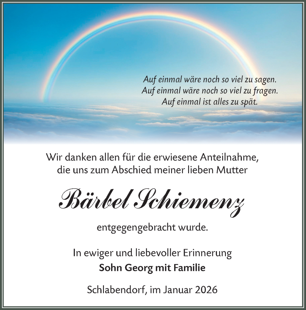 Hier finden Sie alle Traueranzeigen aus der Zeitung, die bisher für Bärbel Schiemenz erschienen sind. Weitere Traueranzeigen, die in der Zeitung erscheinen, werden hier ebenfalls aufgelistet