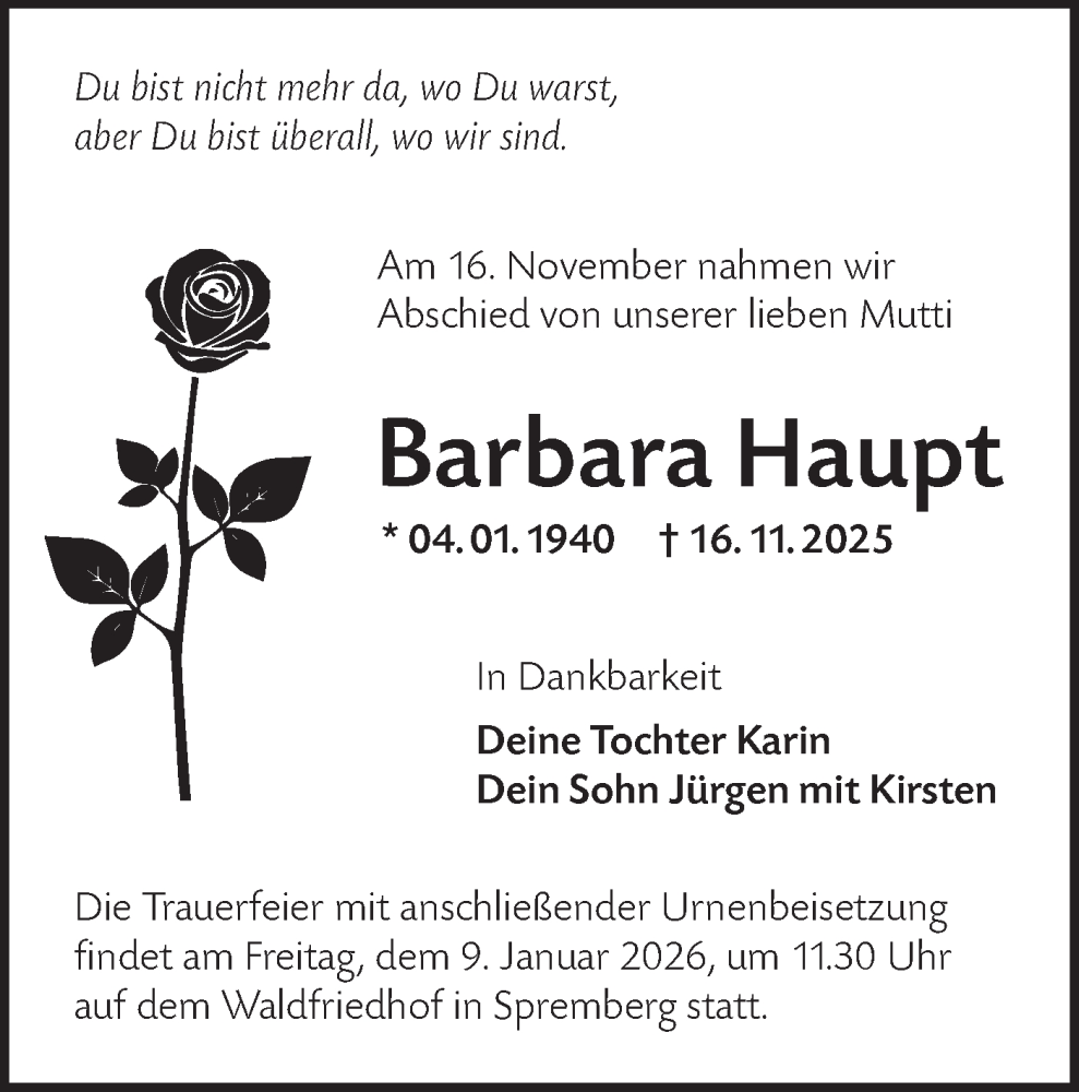 Hier finden Sie alle Traueranzeigen aus der Zeitung, die bisher für Barbara Haupt erschienen sind. Weitere Traueranzeigen, die in der Zeitung erscheinen, werden hier ebenfalls aufgelistet