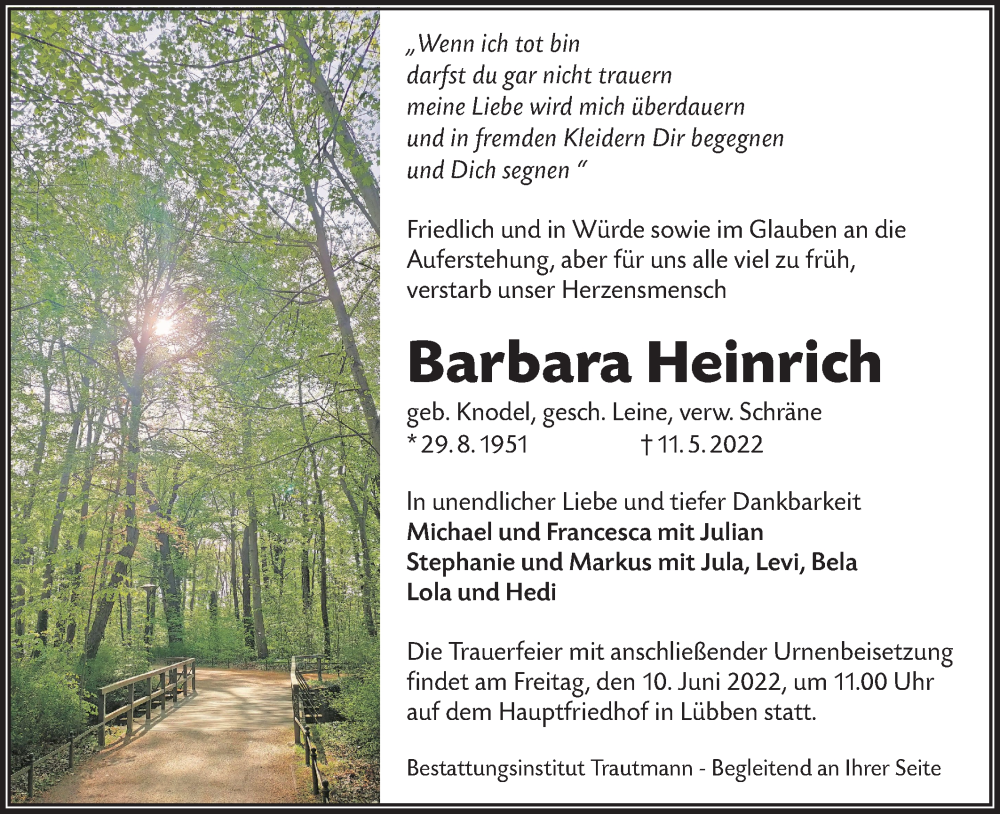 Hier finden Sie alle Traueranzeigen aus der Zeitung, die bisher für Barbara Heinrich erschienen sind. Weitere Traueranzeigen, die in der Zeitung erscheinen, werden hier ebenfalls aufgelistet