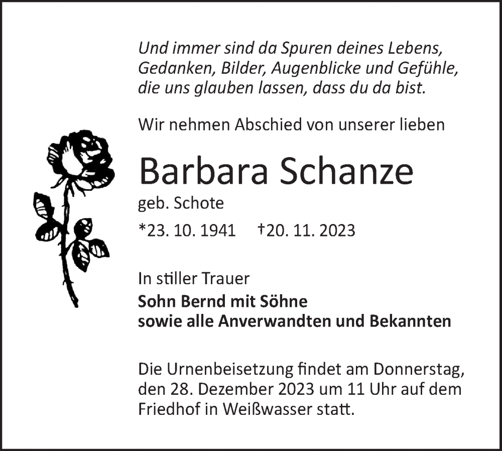 Hier finden Sie alle Traueranzeigen aus der Zeitung, die bisher für Barbara Schanze erschienen sind. Weitere Traueranzeigen, die in der Zeitung erscheinen, werden hier ebenfalls aufgelistet