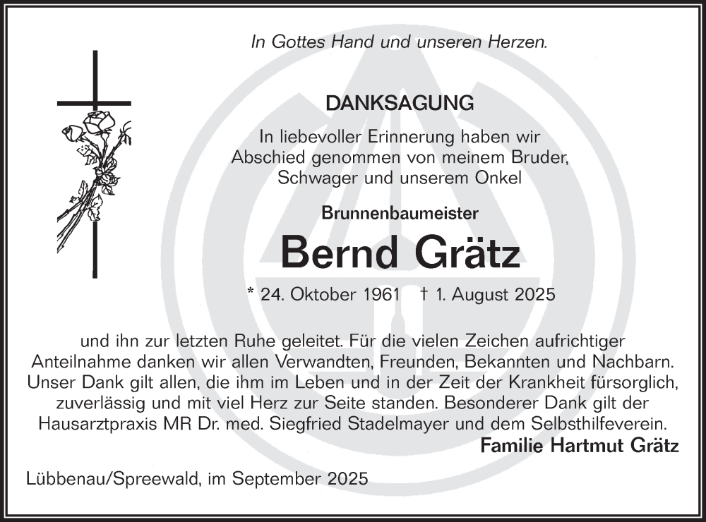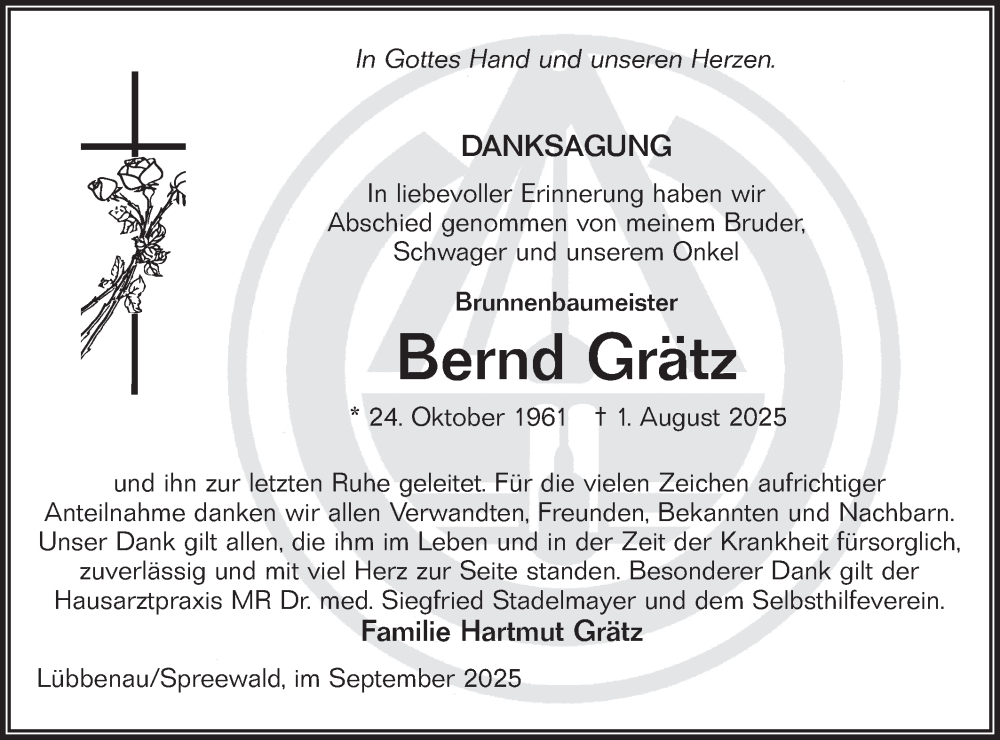 Hier finden Sie alle Traueranzeigen aus der Zeitung, die bisher für Bernd Grätz erschienen sind. Weitere Traueranzeigen, die in der Zeitung erscheinen, werden hier ebenfalls aufgelistet