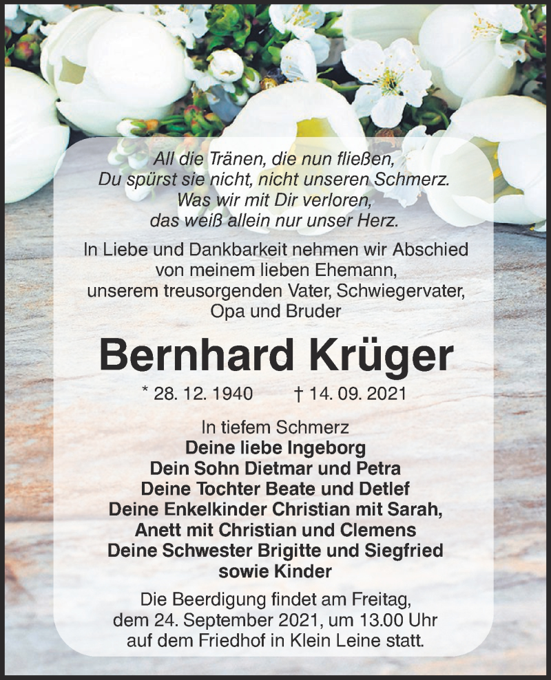 Hier finden Sie alle Traueranzeigen aus der Zeitung, die bisher für Bernhard Krüger erschienen sind. Weitere Traueranzeigen, die in der Zeitung erscheinen, werden hier ebenfalls aufgelistet