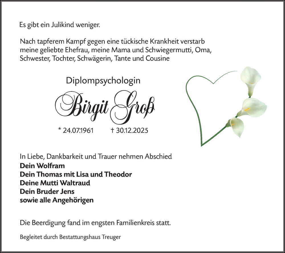 Hier finden Sie alle Traueranzeigen aus der Zeitung, die bisher für Birgit Groß erschienen sind. Weitere Traueranzeigen, die in der Zeitung erscheinen, werden hier ebenfalls aufgelistet