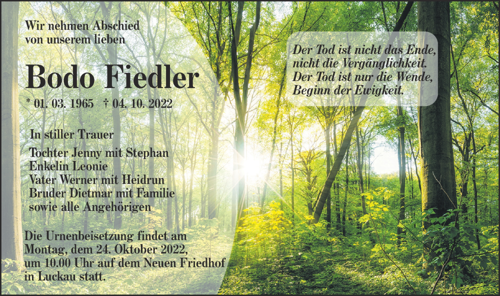 Hier finden Sie alle Traueranzeigen aus der Zeitung, die bisher für Bodo Fiedler erschienen sind. Weitere Traueranzeigen, die in der Zeitung erscheinen, werden hier ebenfalls aufgelistet