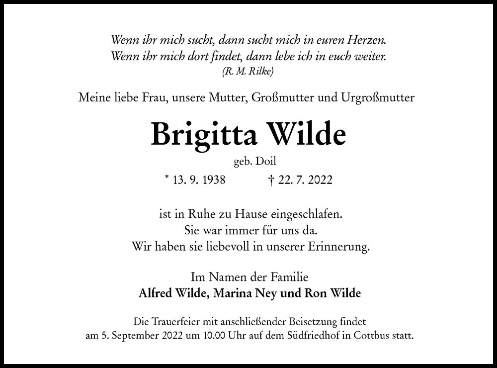 Hier finden Sie alle Traueranzeigen aus der Zeitung, die bisher für Brigitta Wilde erschienen sind. Weitere Traueranzeigen, die in der Zeitung erscheinen, werden hier ebenfalls aufgelistet