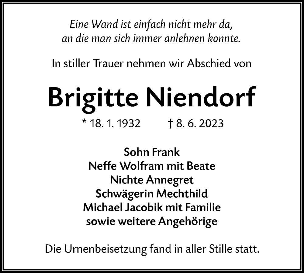 Hier finden Sie alle Traueranzeigen aus der Zeitung, die bisher für Brigitte Niendorf erschienen sind. Weitere Traueranzeigen, die in der Zeitung erscheinen, werden hier ebenfalls aufgelistet