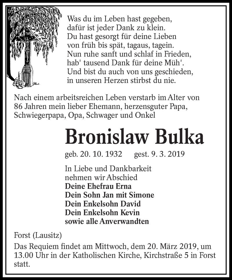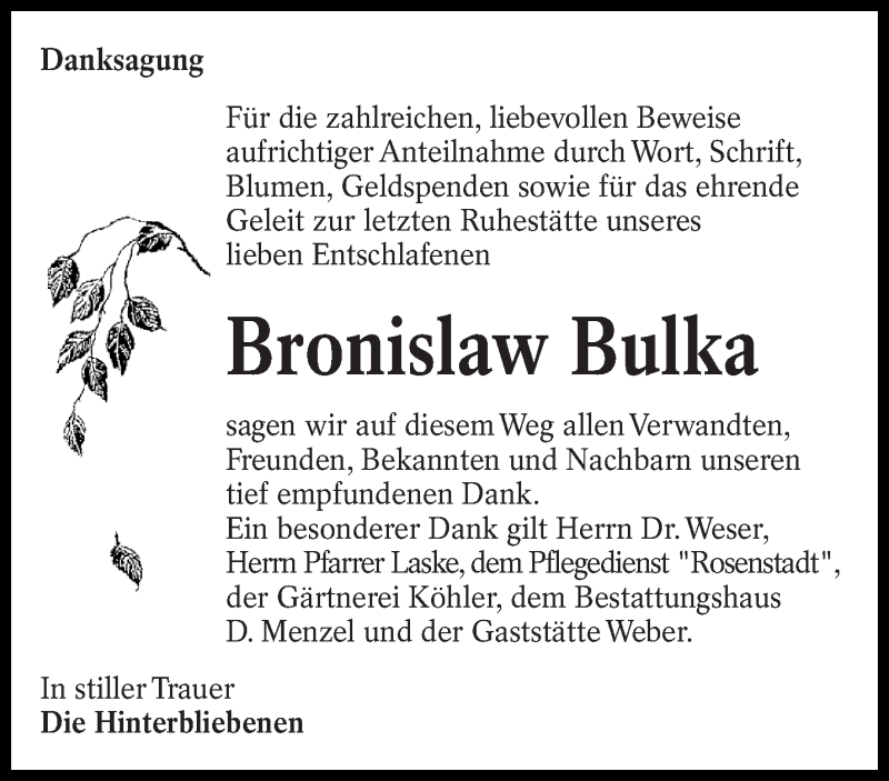 Hier finden Sie alle Traueranzeigen aus der Zeitung, die bisher für Bronislaw Bulka erschienen sind. Weitere Traueranzeigen, die in der Zeitung erscheinen, werden hier ebenfalls aufgelistet