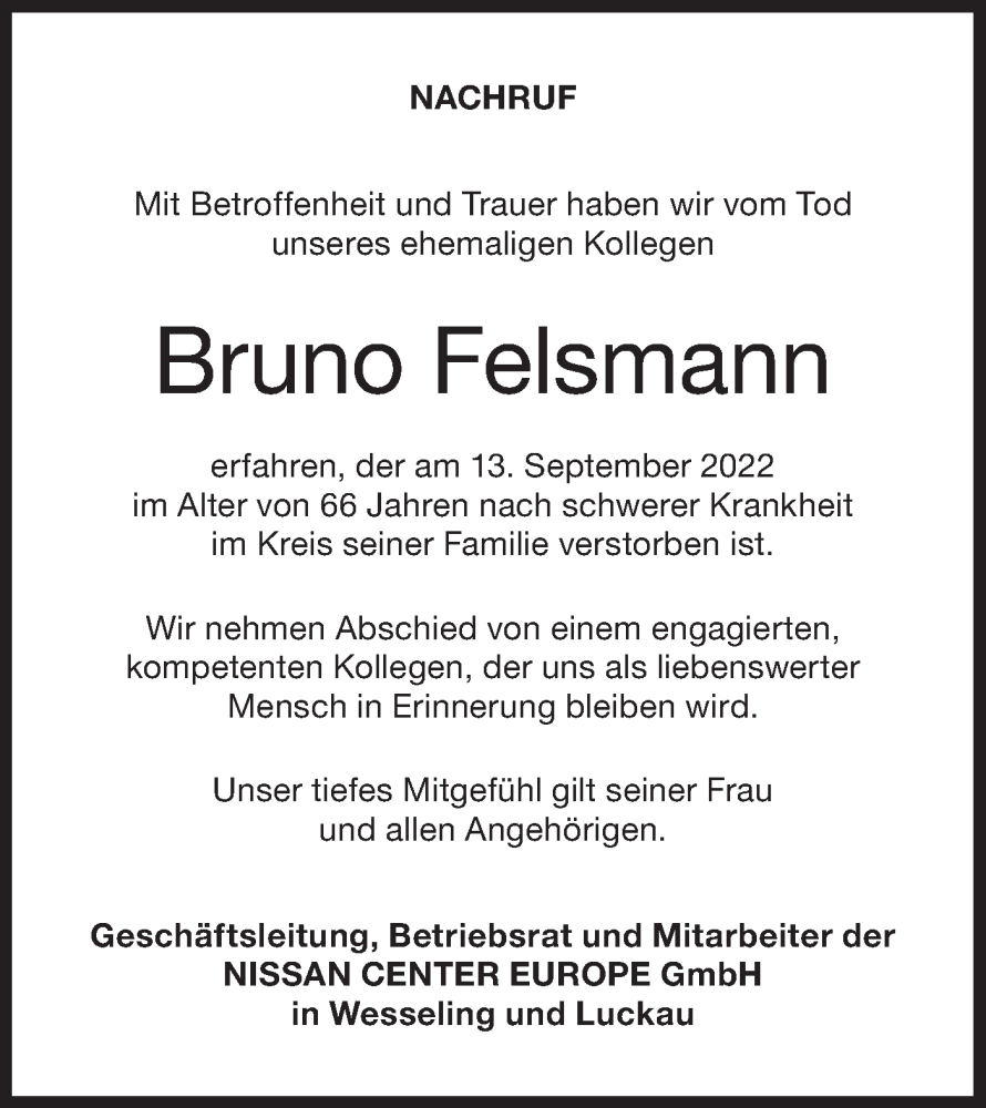 Hier finden Sie alle Traueranzeigen aus der Zeitung, die bisher für Bruno Felsmann erschienen sind. Weitere Traueranzeigen, die in der Zeitung erscheinen, werden hier ebenfalls aufgelistet