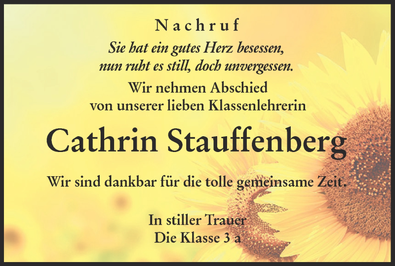 Hier finden Sie alle Traueranzeigen aus der Zeitung, die bisher für Cathrin Stauffenberg erschienen sind. Weitere Traueranzeigen, die in der Zeitung erscheinen, werden hier ebenfalls aufgelistet