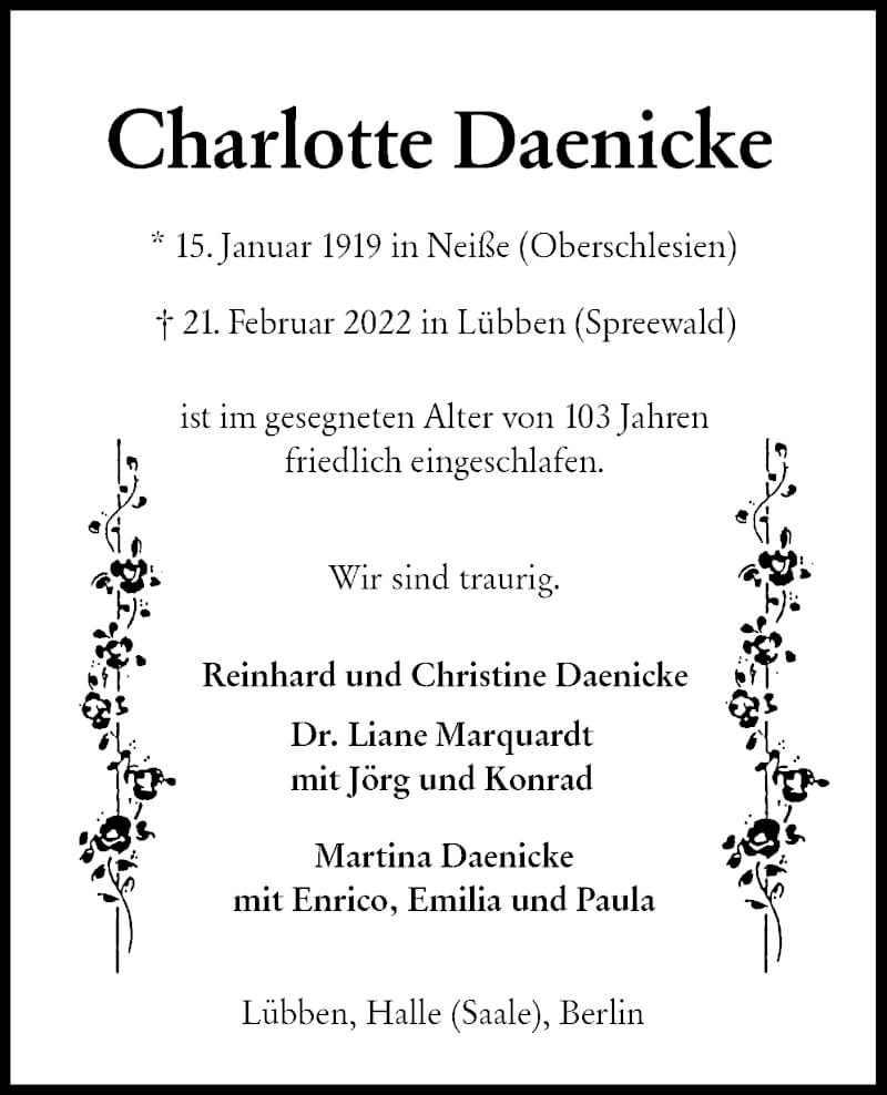 Hier finden Sie alle Traueranzeigen aus der Zeitung, die bisher für Charlotte Daenicke erschienen sind. Weitere Traueranzeigen, die in der Zeitung erscheinen, werden hier ebenfalls aufgelistet