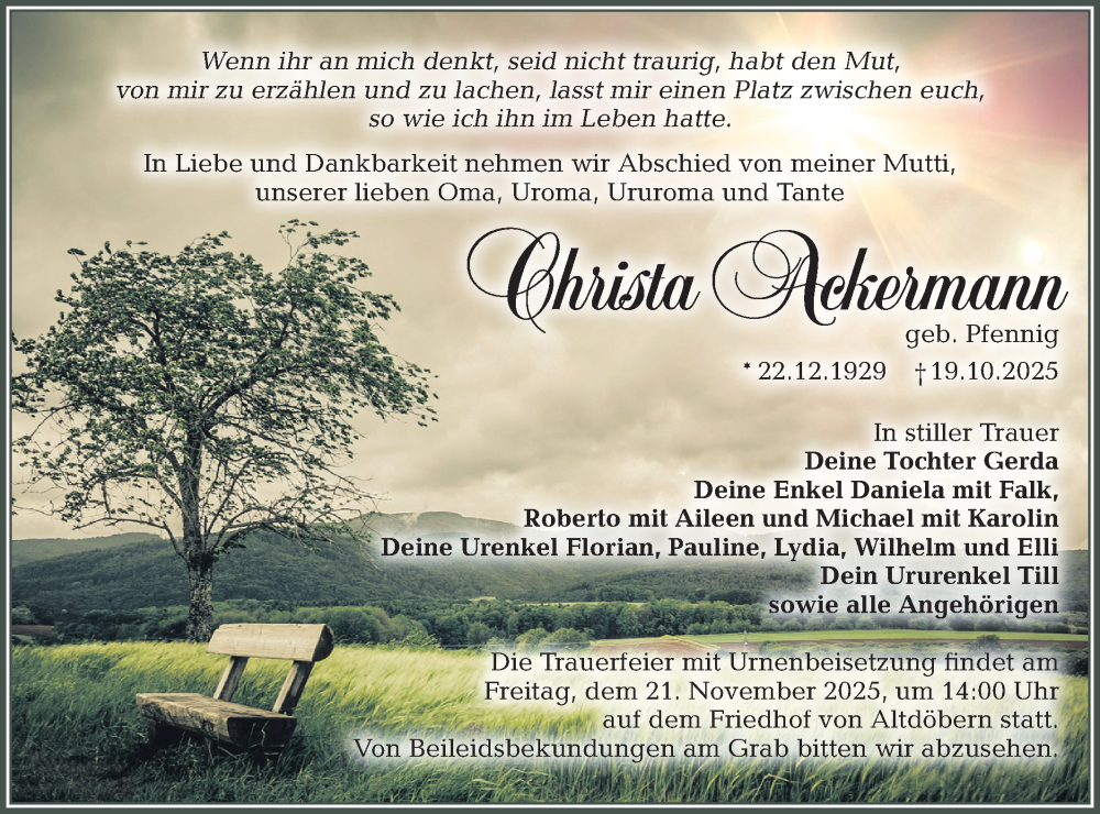 Hier finden Sie alle Traueranzeigen aus der Zeitung, die bisher für Christa Ackermann erschienen sind. Weitere Traueranzeigen, die in der Zeitung erscheinen, werden hier ebenfalls aufgelistet