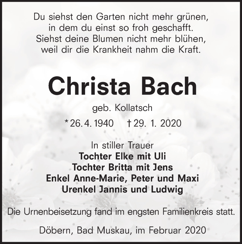 Hier finden Sie alle Traueranzeigen aus der Zeitung, die bisher für Christa Bach erschienen sind. Weitere Traueranzeigen, die in der Zeitung erscheinen, werden hier ebenfalls aufgelistet