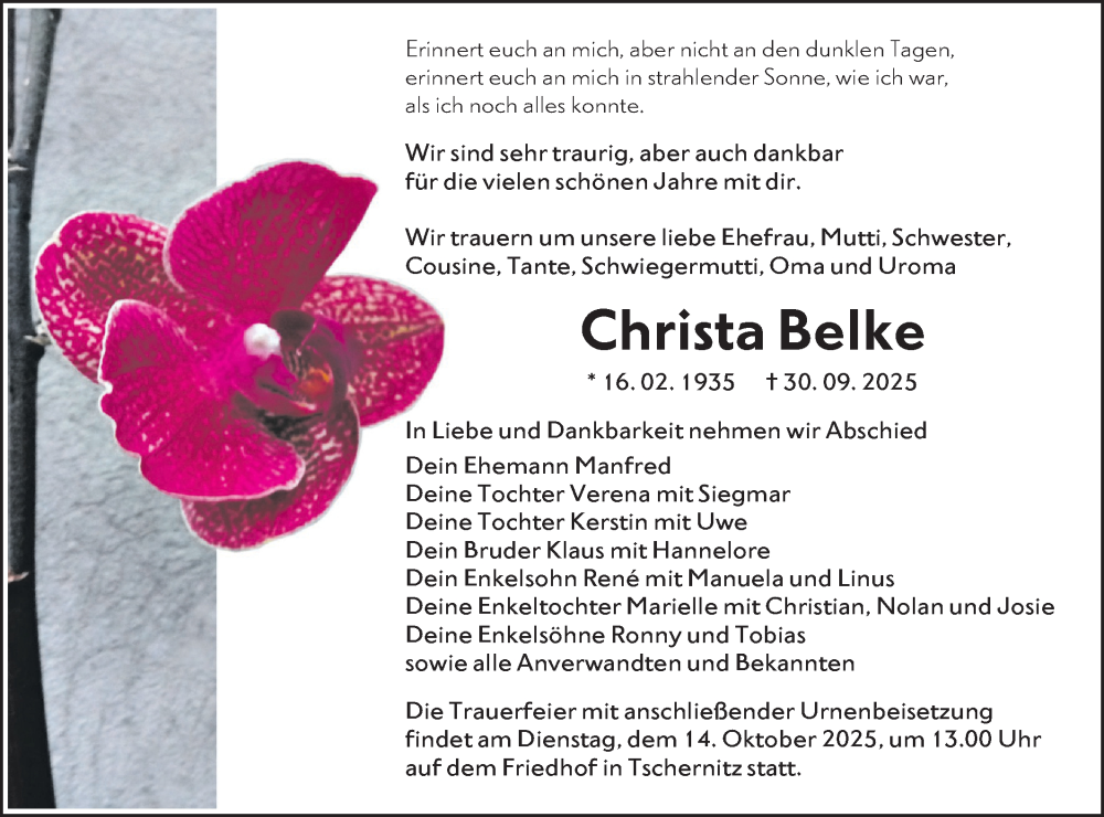 Hier finden Sie alle Traueranzeigen aus der Zeitung, die bisher für Christa Belke erschienen sind. Weitere Traueranzeigen, die in der Zeitung erscheinen, werden hier ebenfalls aufgelistet