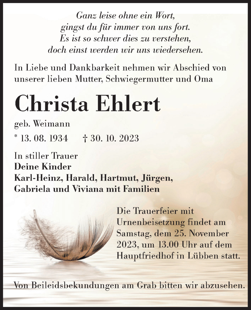 Hier finden Sie alle Traueranzeigen aus der Zeitung, die bisher für Christa Ehlert erschienen sind. Weitere Traueranzeigen, die in der Zeitung erscheinen, werden hier ebenfalls aufgelistet