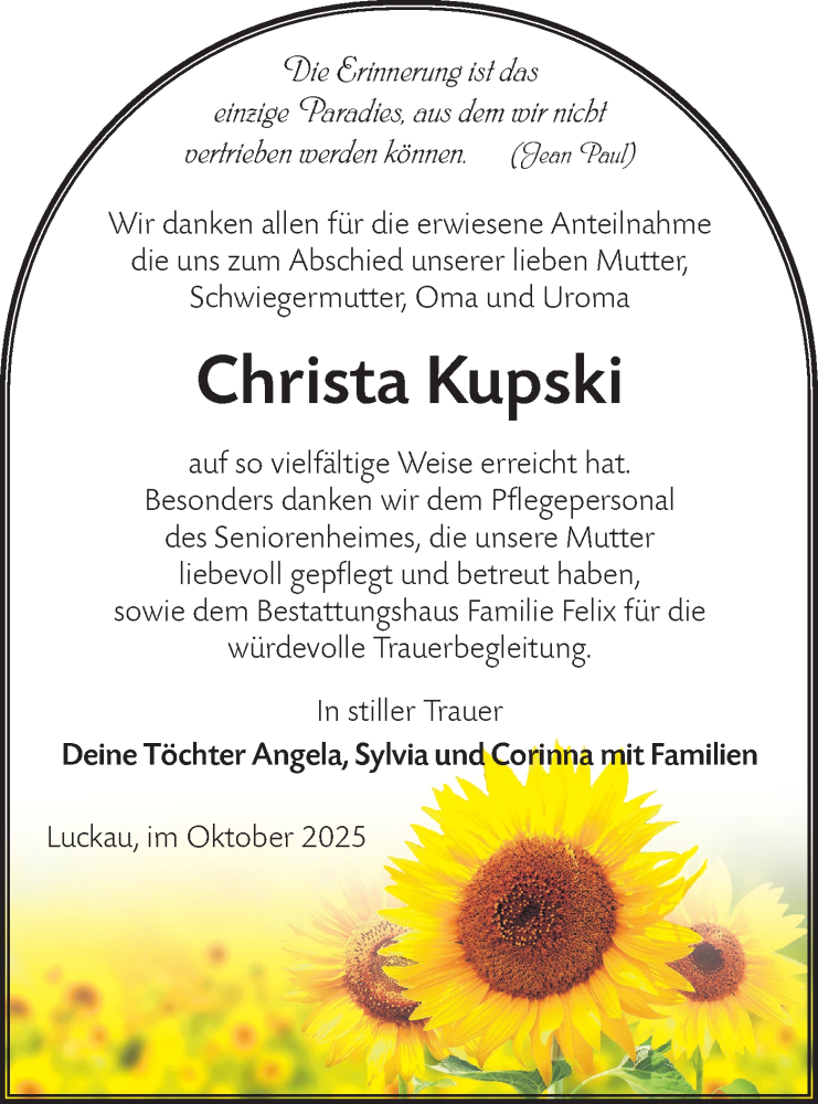Hier finden Sie alle Traueranzeigen aus der Zeitung, die bisher für Christa Kupski erschienen sind. Weitere Traueranzeigen, die in der Zeitung erscheinen, werden hier ebenfalls aufgelistet