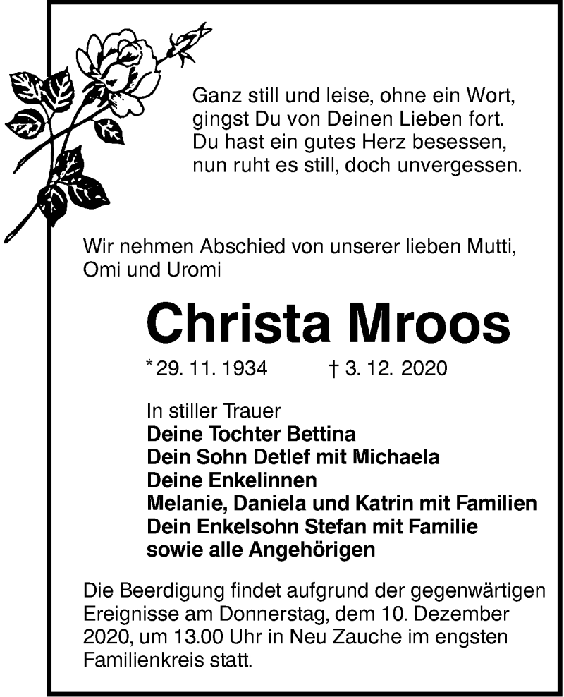 Hier finden Sie alle Traueranzeigen aus der Zeitung, die bisher für Christa Mroos erschienen sind. Weitere Traueranzeigen, die in der Zeitung erscheinen, werden hier ebenfalls aufgelistet