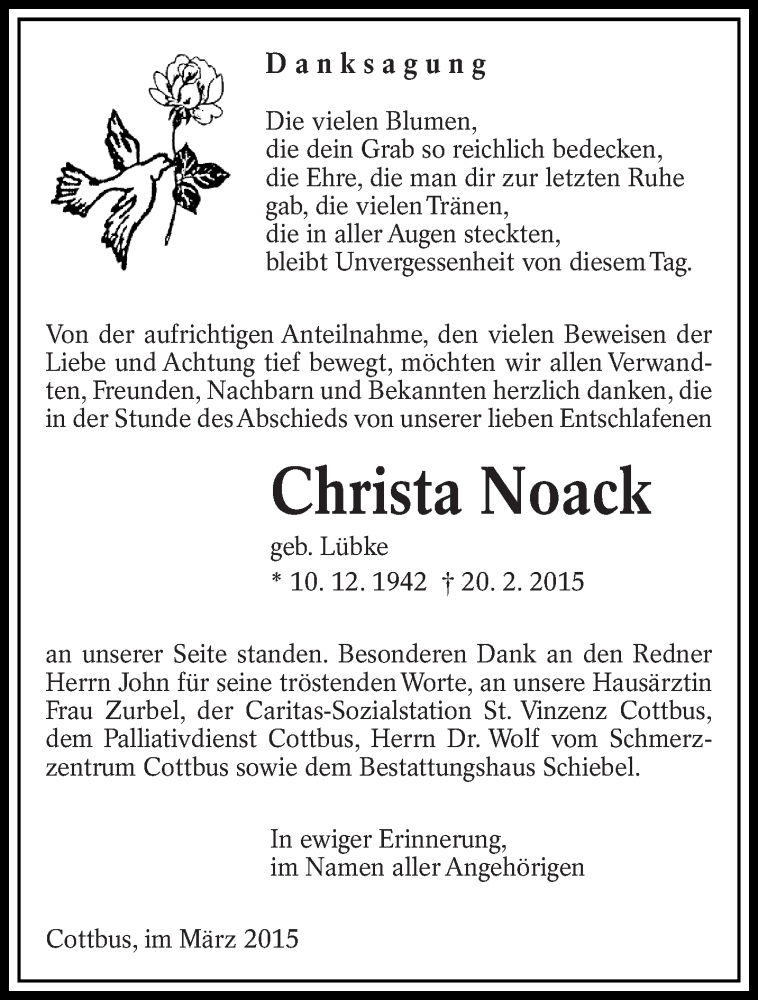 Hier finden Sie alle Traueranzeigen aus der Zeitung, die bisher für Christa Noack erschienen sind. Weitere Traueranzeigen, die in der Zeitung erscheinen, werden hier ebenfalls aufgelistet