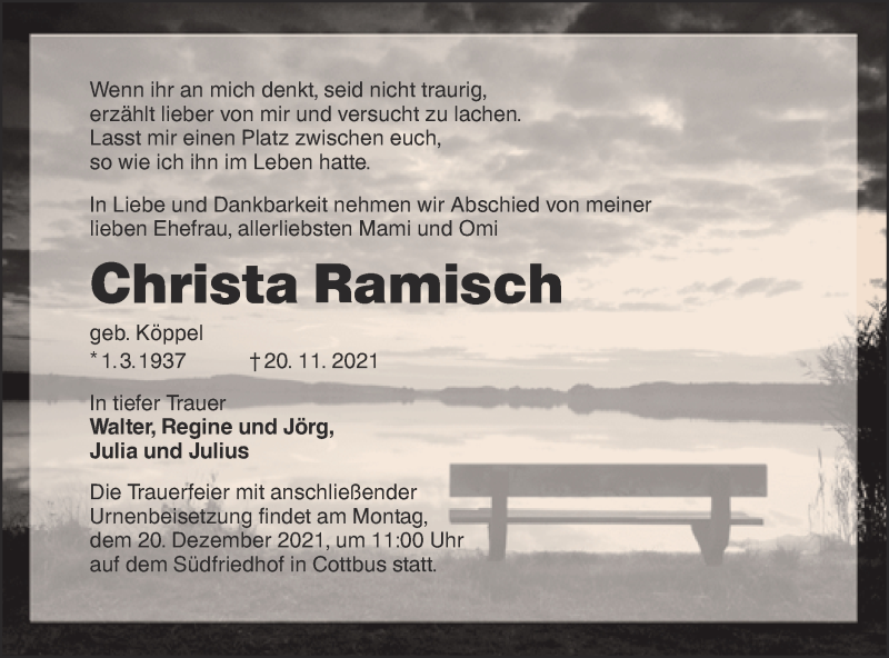 Hier finden Sie alle Traueranzeigen aus der Zeitung, die bisher für Christa Ramisch erschienen sind. Weitere Traueranzeigen, die in der Zeitung erscheinen, werden hier ebenfalls aufgelistet