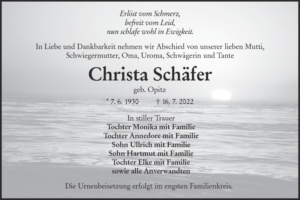 Hier finden Sie alle Traueranzeigen aus der Zeitung, die bisher für Christa Schäfer erschienen sind. Weitere Traueranzeigen, die in der Zeitung erscheinen, werden hier ebenfalls aufgelistet