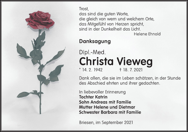 Hier finden Sie alle Traueranzeigen aus der Zeitung, die bisher für Christa Vieweg erschienen sind. Weitere Traueranzeigen, die in der Zeitung erscheinen, werden hier ebenfalls aufgelistet