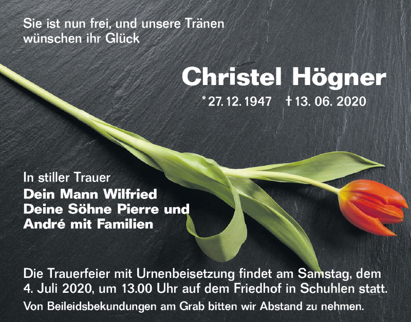 Hier finden Sie alle Traueranzeigen aus der Zeitung, die bisher für Christel Högner erschienen sind. Weitere Traueranzeigen, die in der Zeitung erscheinen, werden hier ebenfalls aufgelistet
