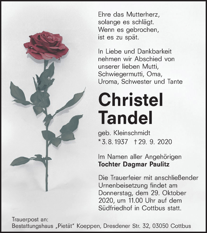 Hier finden Sie alle Traueranzeigen aus der Zeitung, die bisher für Christel Tandel erschienen sind. Weitere Traueranzeigen, die in der Zeitung erscheinen, werden hier ebenfalls aufgelistet