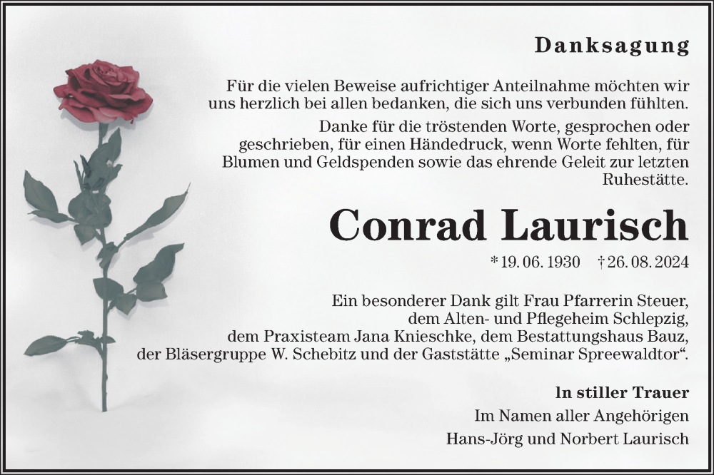 Hier finden Sie alle Traueranzeigen aus der Zeitung, die bisher für Conrad Laurisch erschienen sind. Weitere Traueranzeigen, die in der Zeitung erscheinen, werden hier ebenfalls aufgelistet