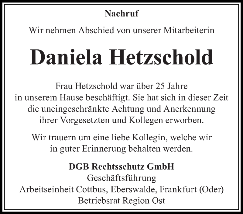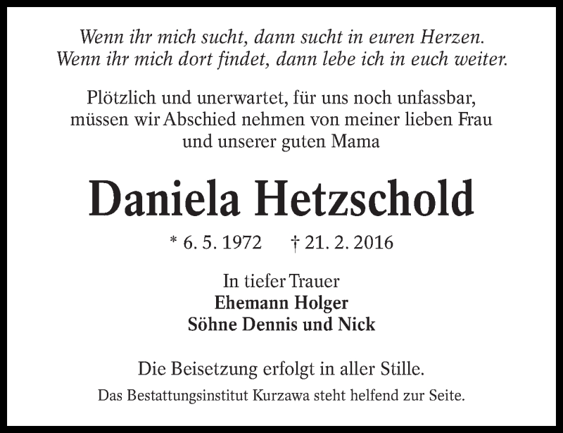 Hier finden Sie alle Traueranzeigen aus der Zeitung, die bisher für Daniela Hetzschold erschienen sind. Weitere Traueranzeigen, die in der Zeitung erscheinen, werden hier ebenfalls aufgelistet