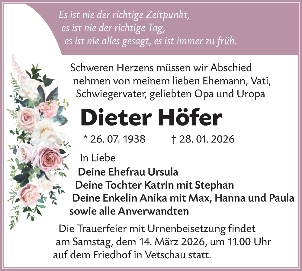 Hier finden Sie alle Traueranzeigen aus der Zeitung, die bisher für Dieter Höfer erschienen sind. Weitere Traueranzeigen, die in der Zeitung erscheinen, werden hier ebenfalls aufgelistet