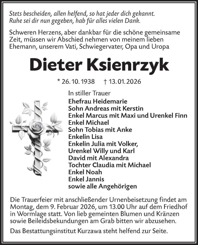 Hier finden Sie alle Traueranzeigen aus der Zeitung, die bisher für Dieter Ksienrzyk erschienen sind. Weitere Traueranzeigen, die in der Zeitung erscheinen, werden hier ebenfalls aufgelistet