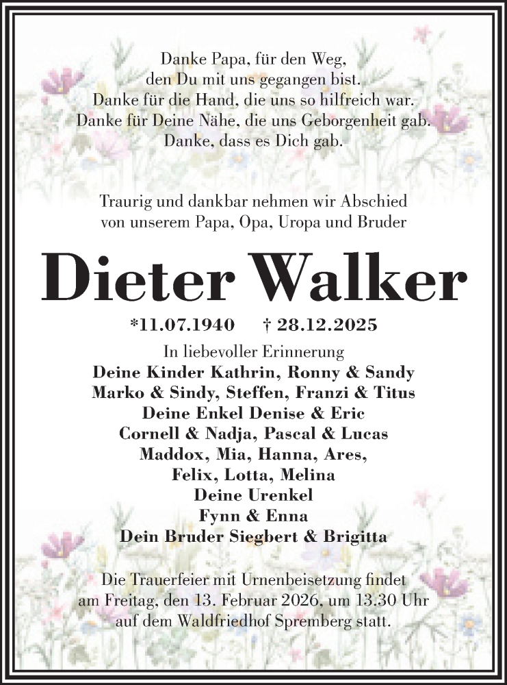 Hier finden Sie alle Traueranzeigen aus der Zeitung, die bisher für Dieter Walker erschienen sind. Weitere Traueranzeigen, die in der Zeitung erscheinen, werden hier ebenfalls aufgelistet