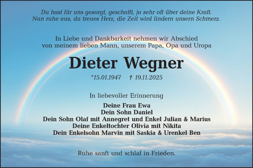 Hier finden Sie alle Traueranzeigen aus der Zeitung, die bisher für Dieter Wegner erschienen sind. Weitere Traueranzeigen, die in der Zeitung erscheinen, werden hier ebenfalls aufgelistet