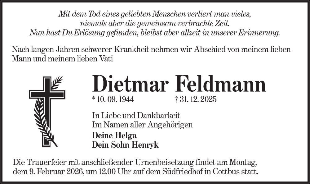 Hier finden Sie alle Traueranzeigen aus der Zeitung, die bisher für Dietmar Feldmann erschienen sind. Weitere Traueranzeigen, die in der Zeitung erscheinen, werden hier ebenfalls aufgelistet