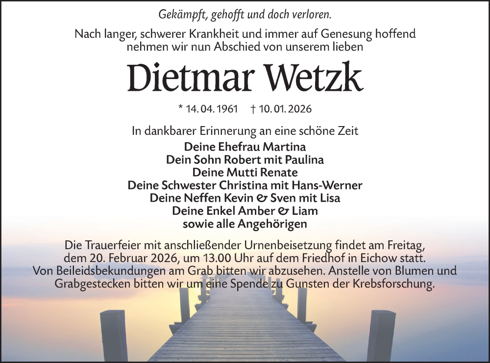 Hier finden Sie alle Traueranzeigen aus der Zeitung, die bisher für Dietmar Wetzk erschienen sind. Weitere Traueranzeigen, die in der Zeitung erscheinen, werden hier ebenfalls aufgelistet